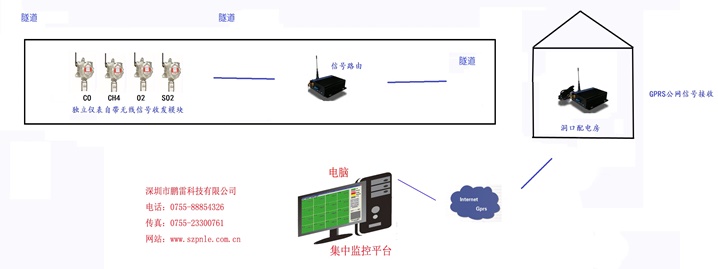 儀表本身配置的無線信號模塊,采用的數(shù)據(jù)無線傳輸距離可達(dá)3-4公里,但是隨著隧道的工況和彎道不同,可能需要配置信號中繼器。視具體隧道的長度,來配置1-2個信號中繼器,信號中繼器也采用畜電池供電。